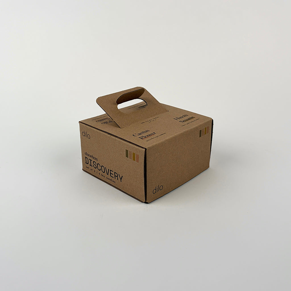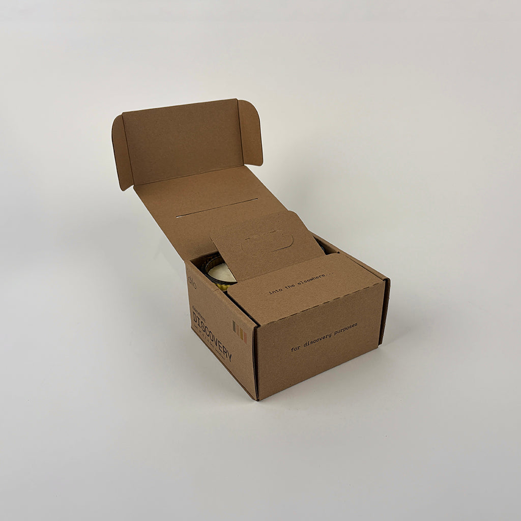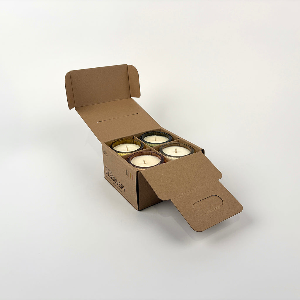 The objective was to create a protective, robust shipping box while maintaining a clean and beautiful unboxing experience for this candle gift set.