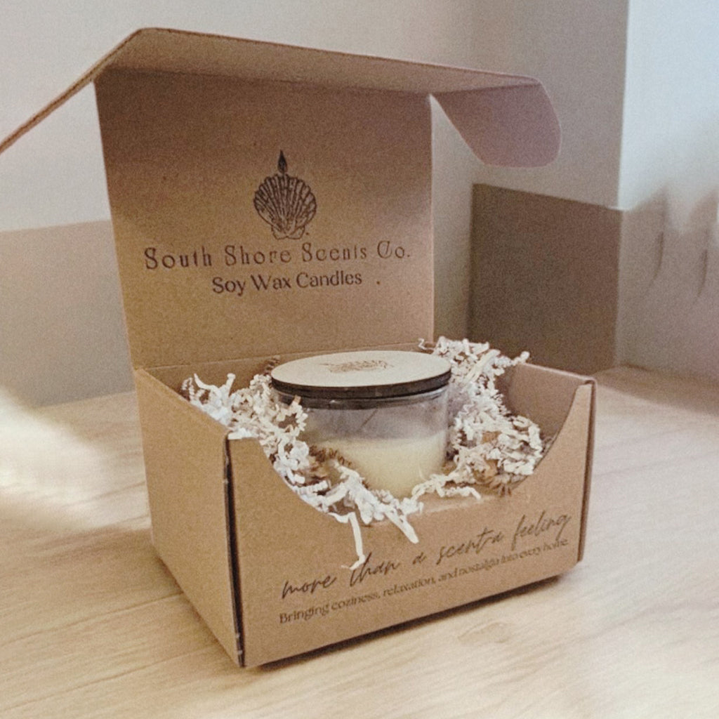 Kelly from South Shore Scents personalizes her Straight Sided Tumbler Shipping Boxes with custom stamps and crinkle paper to make them feel like a gift for her monthly subscribers.